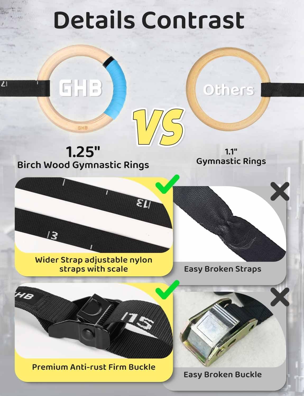 - (Ultra-high Load-bearing Performance 1.25″ Olympic Rings) The exercises gymnastic rings are made of birch wooden 1.25″,which is wide for comfortable grip,better than previous 1.1″.GHB pull up rings have great load-bearing capacity and stronger