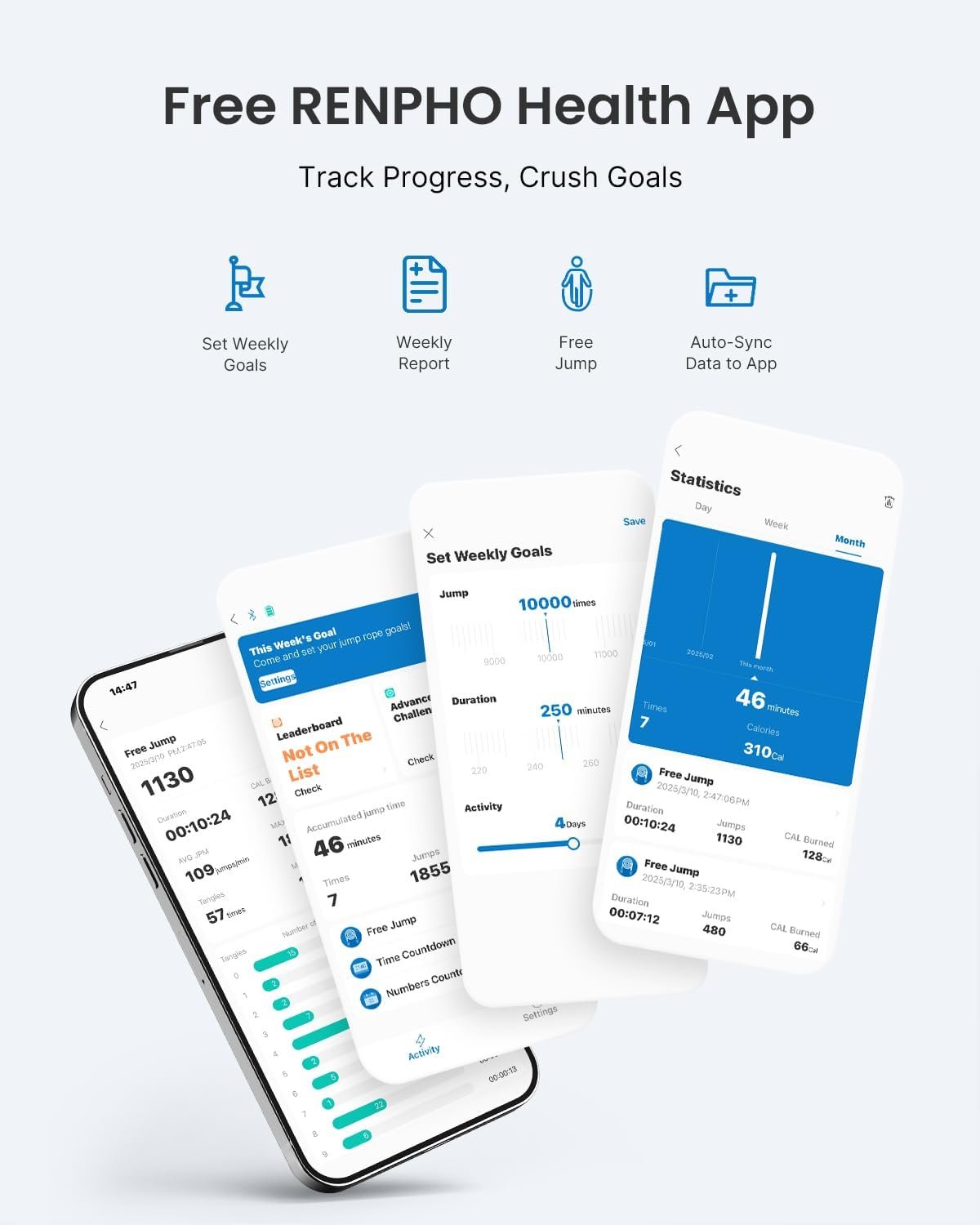 - Smart Renpho Health App: RENPHO smart digital jump rope can connect to the Renpho Health App (iOS 7+ & Android 4.3+) via Bluetooth to tell you about the cardio exercise. APP will keep track of your workout data, including jump count, calories burned, time spent jumping etc, to analyze your periodic workout data. It is also a good choice for Christmas gifts.