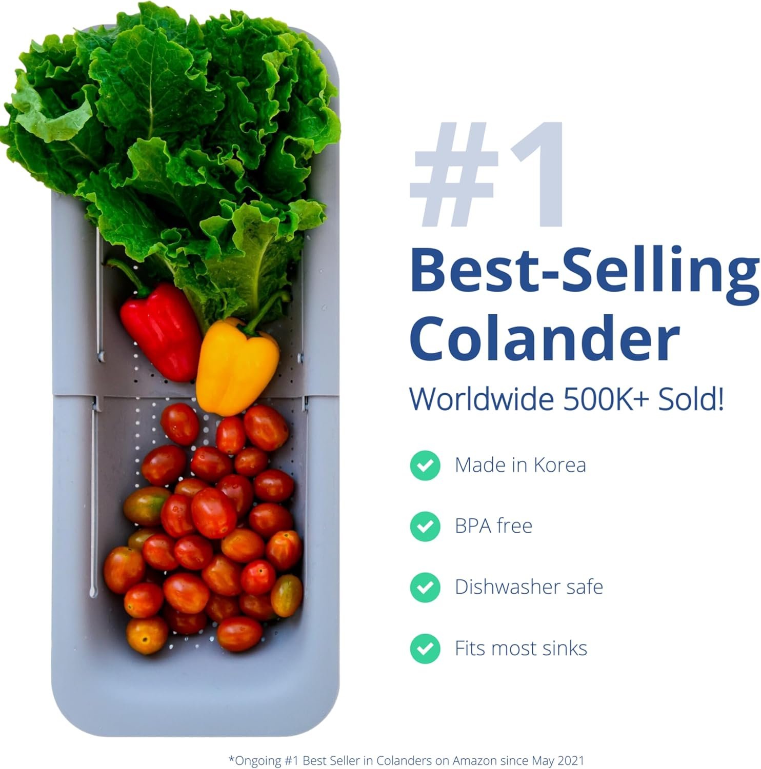 BLUE GINKGO Over the Sink Colander Strainer Basket – Wash Vegetables and Fruits, Drain Cooked Pasta and Dry Dishes – Extendable – New Home Kitchen Essentials (7.9W x 14-19L x 2.75H) – Gray